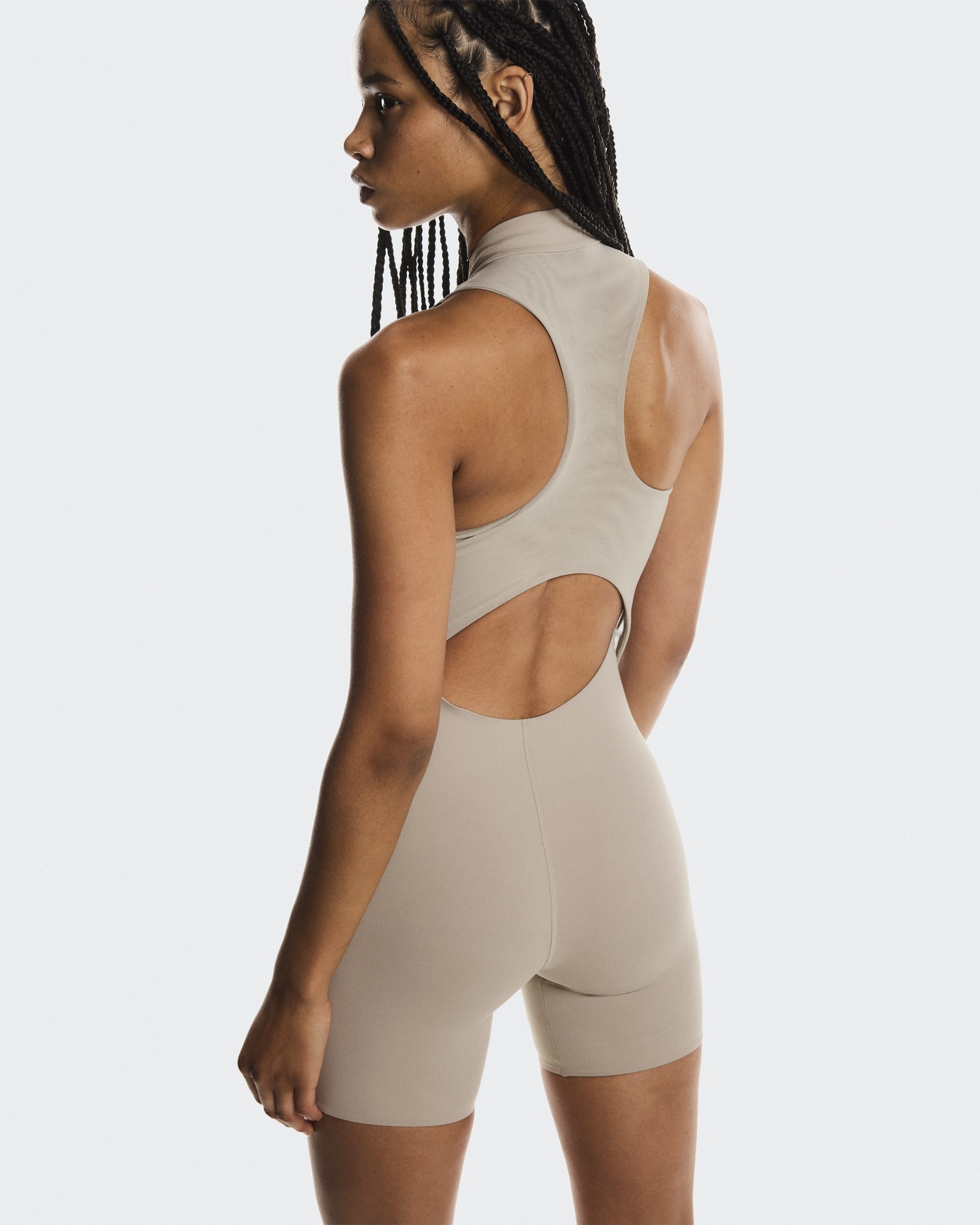 A fitted bodysuit made from a soft fabric. Complete with an open mesh back and smooth bonded edges.